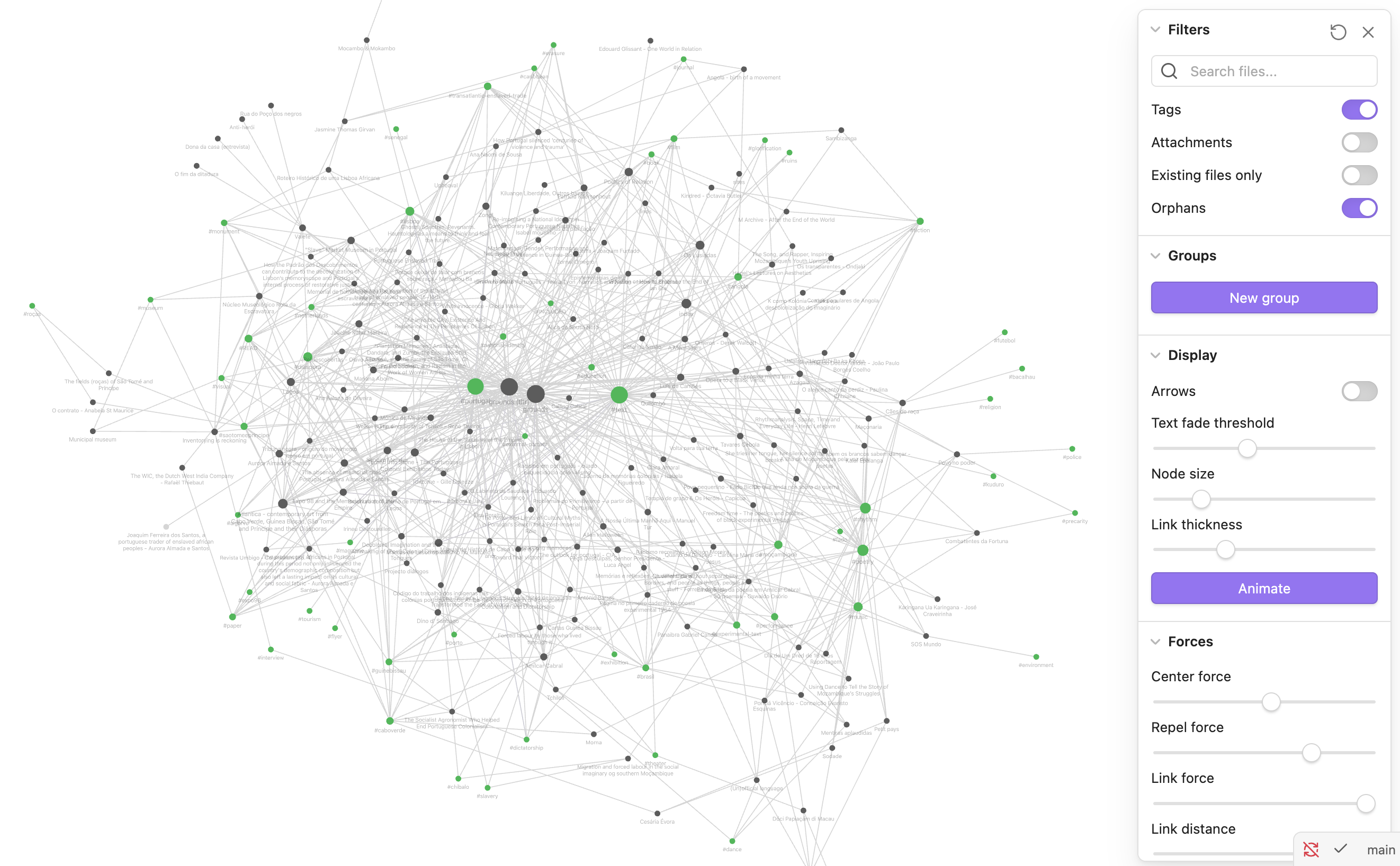 Due to the large amount of sources, I have decided to use the software Obsidian hosted online in this platform. Each page under the artifacts folder shall have its bibliographic reference, notes and a collection of tags (e.g. moçambique, performance, fiction), which allows for connections to later be found. Instead of hierarchically, I can visualise, navigate and search these sources through a graph view (see ^fig-graph).