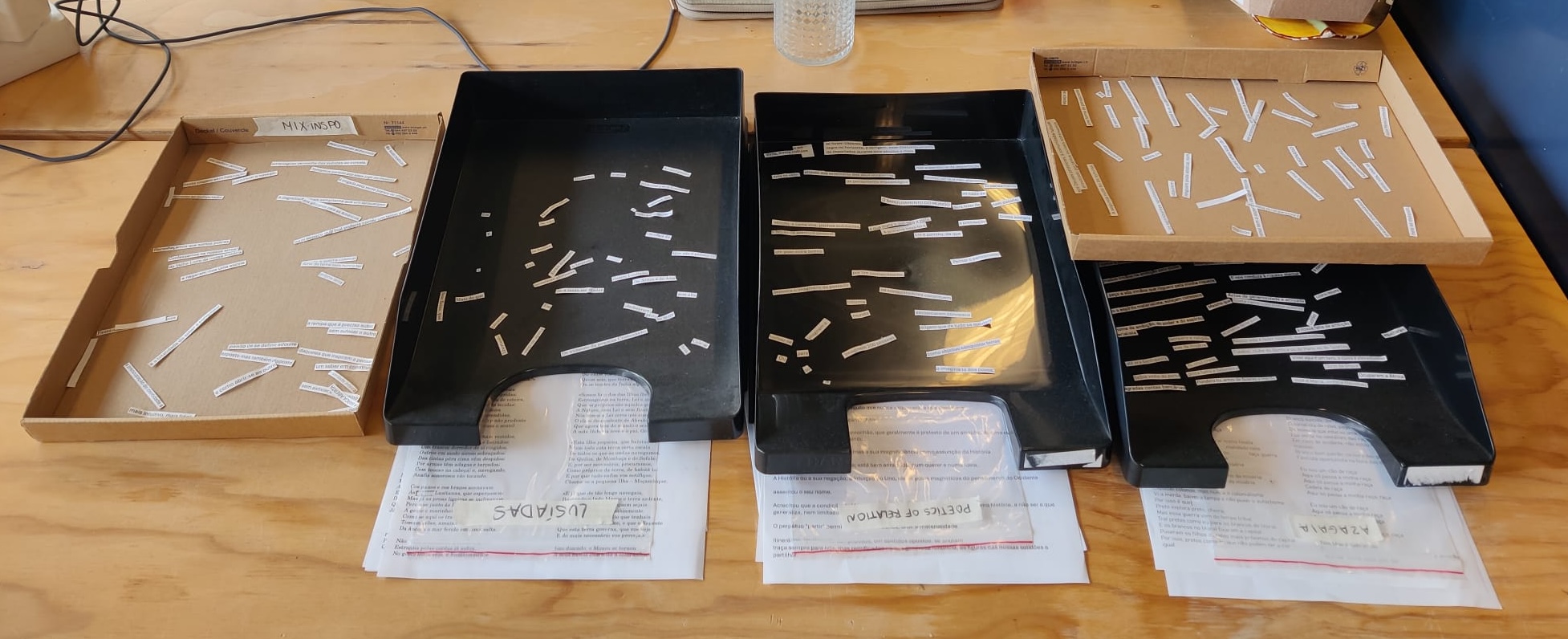 I am convinced that I can make a meaningful contribution by rewriting this treasured book through the words, sentences and paragraphs of these creators. More specifically, orchestrating cut-outs of the epic poem together with cut-outs from texts of de-colonial authors with an emphasis on Lusophony. The texts can be interviews, academic papers, songs, poetry, books, theatre pieces, performances, visual art, conversations, or others, all on equal grounds. To make use of a certain text, I engaged with it theoretically, the words are not just removed and decontextualised, since the point is not to assimilate or annihilate them, but to elevate them. Sentences are prioritised over words, in order to limit the amount of freedom I have with the emerging combination of texts. The more of the cut-out text remains, the more opacity is preserved.
