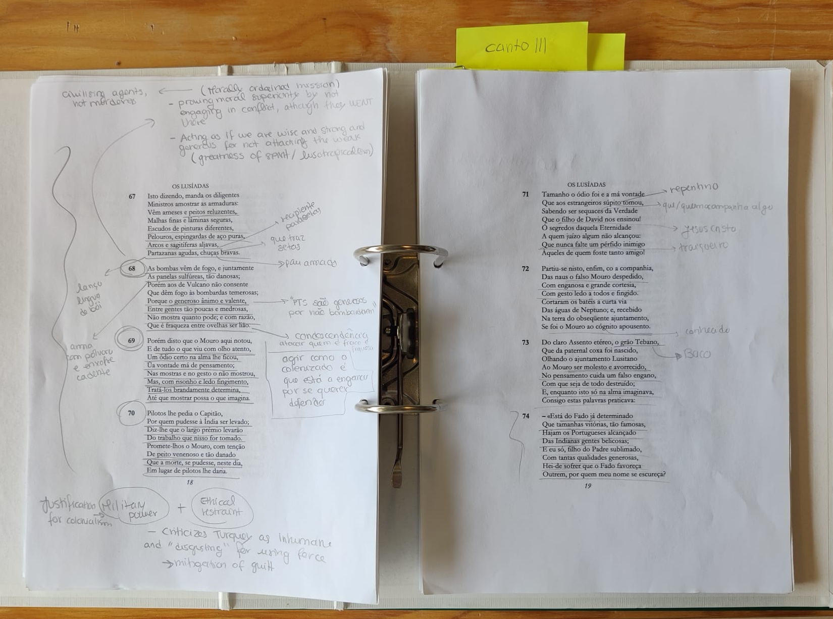 The immediate question that arises is if it makes sense to keep the same structure as the epic poem. Although, Os Lusíadas is not completely linear (jumping back and fourth in time), it is chronological. Beyond that, it has delineated cantos, 1102 rigid stanzas and heroic-decasyllabic verses. Replicating this structure could mean to be rooted in the original. And while that is true, I can see advantages that lead me into taking that decision. Other than the divine elements and the nationalist rhetoric that praises the Portuguese, the structure of the epic is what makes it so mystical - creating such a work is perceived as extremely complex and genius. Choosing not to do so could mean losing an opportunity to overshadow its ingenuity - relevant when the goal is to dismantle it and actually talk about the underlying violence. Thus, it makes sense to create 1102 ABABABCC stanzas with decasyllabic verses, but in a non-linear narrative.